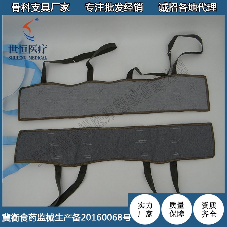 ? 由優(yōu)質(zhì)綠帆布、絨棉、織帶、活扣組成。鎖定盤骨,便于牽引。適合骨盆全形,貼身,舒適,壓力均勻,不需另加襯墊,便能避免皮膚損傷。