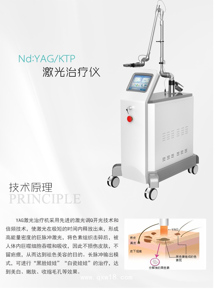 Nd:YAG/KTP激光治療機(jī)采用先進(jìn)的激光調(diào)Q開光技術(shù)和倍頻技術(shù),使激光在極短的時間內(nèi)釋放出來,形成高能量密度的巨脈沖激光,將色素組織擊碎后,被人體內(nèi)巨噬細(xì)胞吞噬和吸收,因此不損傷皮膚,不留疤痕,從而達(dá)到祛色美容的目的。長脈沖輸出模式,可進(jìn)行“黑臉娃娃”“白瓷娃娃”的治療,達(dá)到美白、嫩膚、收縮毛孔等效果。