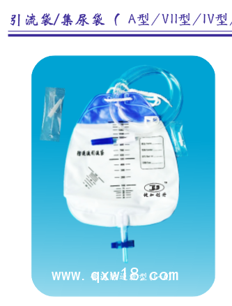 ???? I型(普通引流袋)由排液開關(guān) [十字閥/拉拔閥/單手夾/旋轉(zhuǎn)閥/雙翼閥(B型)/上控閥(C 型)]、排液管(選配件)、袋體、掛繩(選配件)、懸吊裝置(選配件)、上接導管(選配件)、引入管(選配件)、止流夾(選配件)、接頭、接頭護帽組成。II型(防逆流引流袋)由排液開關(guān)[十字閥/拉拔閥/單手夾/旋轉(zhuǎn)閥/雙翼閥(B型)/上控閥(C 型)]、排液管、袋體、防逆流膜片、掛繩、上接導管(選配件)、引入管、懸吊裝置(掛環(huán)/掛架)、止流夾(單手夾/片夾)、床單夾(選配件)、接頭(或帶采樣口接頭)、接頭護帽、轉(zhuǎn)換接頭(選配件)、排液閥插接管(C型)、排液接頭(選配件/C型)組成。III型(精密計量引流袋)由計量盒與貯液袋連接組成,其中包括計量盒排液開關(guān)、計量盒排出管、貯液袋、計量盒、導流膜、止回閥、懸吊裝置、通氣口、接頭(或帶采樣口接頭)、接頭護帽、引入管 、止流夾(單手夾/片夾)、床單夾、貯液袋排液開關(guān)[十字閥/拉拔閥/單手夾/旋轉(zhuǎn)閥/雙翼閥(B型)/上控閥(C 型)]、貯液袋排出管、轉(zhuǎn)換接頭(選配件)、排液閥插接管(C型)、排液接頭(選配件/C型)。IV-A型(腿袋)由排液開關(guān)(十字閥/拉拔閥/單手夾/旋轉(zhuǎn)閥)、排液管、袋體、防逆流膜片、綁帶、上接導管(選配件)、引入管(選配件)、接頭(或帶采樣口接頭)、接頭護帽組成。V型(負壓引流袋)由排液開關(guān)[十字閥/拉拔閥/單手夾/旋轉(zhuǎn)閥/雙翼閥(B型)/上控閥(C 型) ]、排液管、袋體、防逆流膜片、掛繩、上接導管(選配件)、引入管、懸吊裝置(掛環(huán)/掛架)、止流夾(單手夾/片夾)、床單夾(選配件)、接頭(或帶采樣口接頭)、接頭護帽、轉(zhuǎn)換接頭(選配件)、負壓裝置、排液閥插接管(C型)、排液接頭(選配件/C型)組成。VI型(尿套型引流袋)由排液開關(guān)[十字閥/拉拔閥/單手夾/旋轉(zhuǎn)閥/雙翼閥(B型)/上控閥(C 型)]、排液管、袋體、防逆流膜片(選配件)、掛繩(選配件)、上接導管(選配件)、引入管、懸吊裝置(掛環(huán)/掛架)、止流夾(單手夾/片夾)、床單夾(選配件)、尿套、排液閥插接管(C型)、排液接頭(選配件/C型),組成。VII型(側(cè)排式引流流)由排液開關(guān)(單手夾/旋轉(zhuǎn)閥)、排液管、袋體、防逆流膜片(選配件)、掛繩(選配件)、上接導管(選配件)、引入管(選配件)、懸吊裝置(選配件)、止流夾(選配件)、床單夾(選配件)、接頭(選配件)、接頭護帽(選配件)、轉(zhuǎn)換接頭(選配件)、排液接頭組成,VIII(嬰兒引流袋)由袋體、熱熔壓敏膠、海綿(選配件)、隔離紙、尿液收集孔組成。