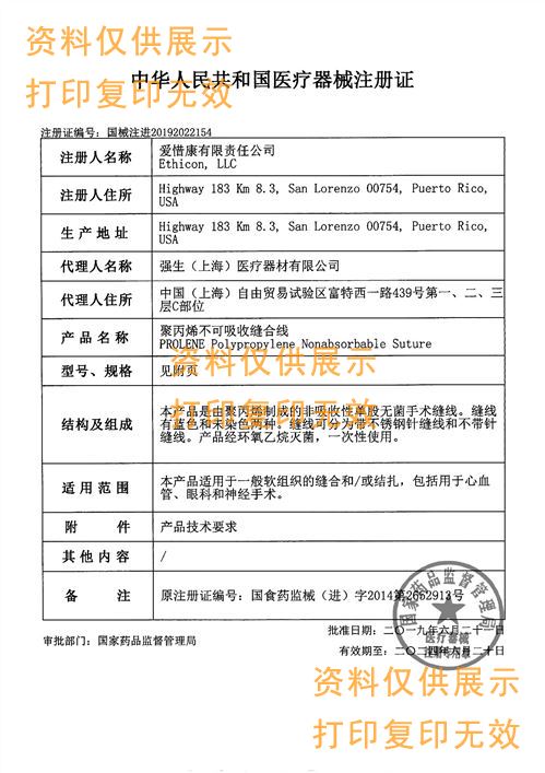 本產(chǎn)品是由聚丙烯制成的非吸收性單股無菌手術(shù)縫線??p線有藍(lán)色和未染色兩種??p線可分為帶不銹鋼針縫線和不帶針縫線。產(chǎn)品經(jīng)環(huán)氧乙烷滅菌,一次性使用