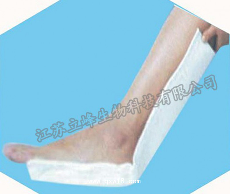 4、將夾板內(nèi)側(cè)厚的無紡棉層緊貼皮膚放在需固定的部位,根據(jù)需要塑型,同時用紗布繃帶或彈性繃帶纏繞固定;