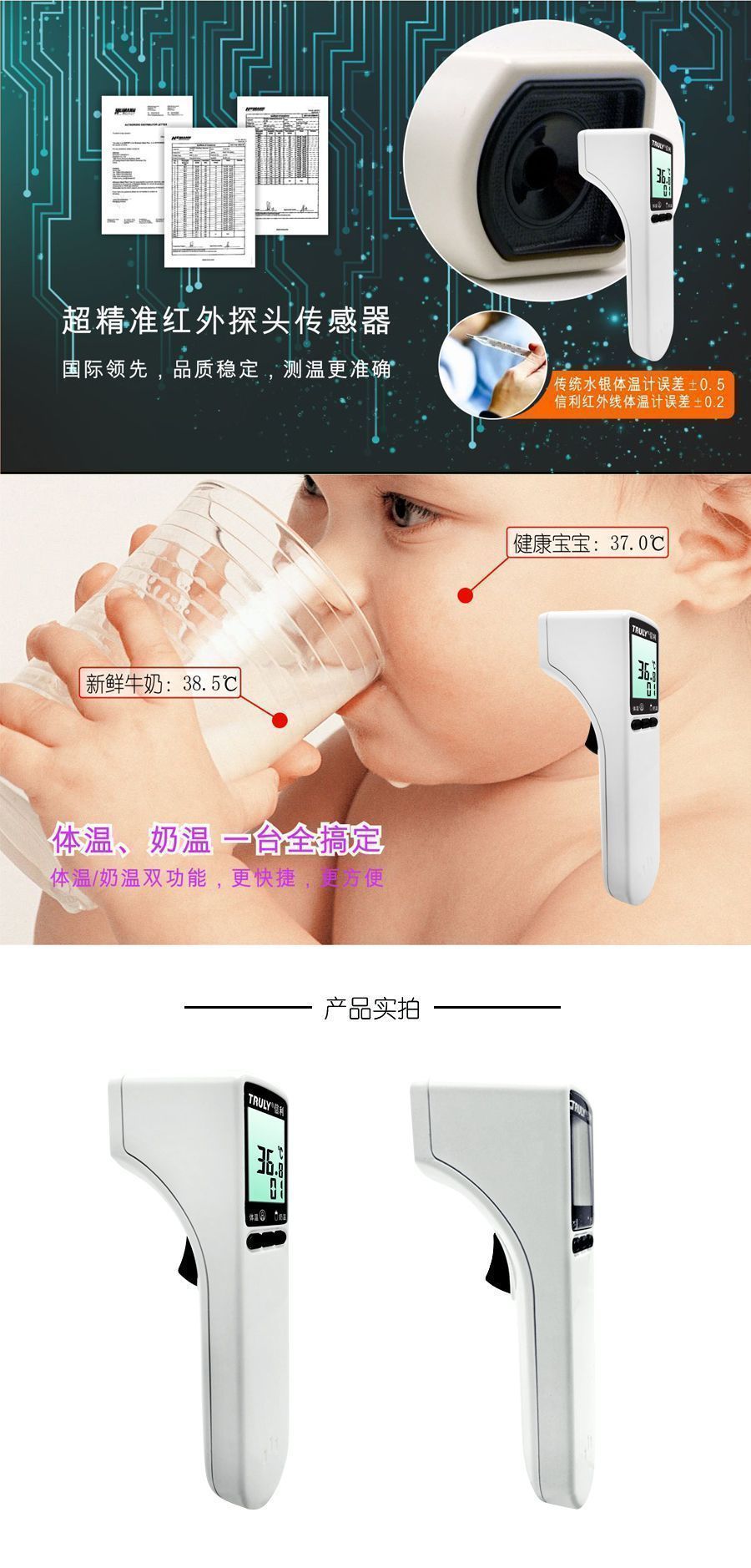 ??4、紅外線(xiàn)體溫計(jì)非常智能化,精度高、誤差小, 準(zhǔn)度?±0.2℃?。信利采用近的紅外技術(shù)與電子技術(shù),從體溫?cái)?shù)據(jù)到數(shù)字的處理非常快,精度高,能夠準(zhǔn)確的把體溫反饋給使用者。
