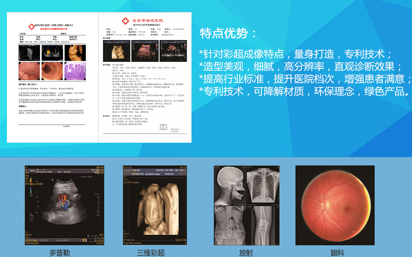 適用于醫(yī)院CR、DR、MRI、CT、DSA等醫(yī)用成像設(shè)備的成像及A超、B超、C超、M超彩色照相膠片、圖文報告、波拉片及病理科成像設(shè)備的圖像和診斷報告的打印。??