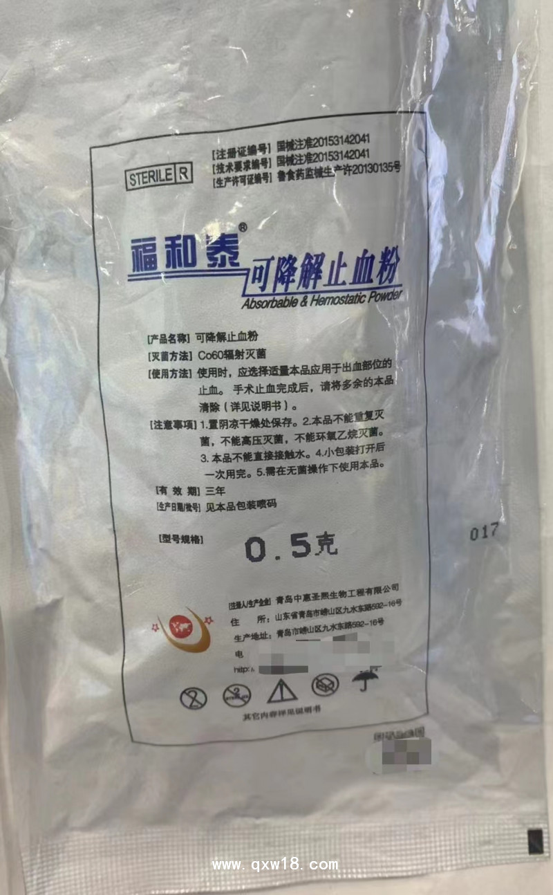 可降解止血粉(福和泰)由再生纖維素通過物化反應(yīng)制備而成的一種無(wú)菌可降解止血粉,其具體材料組成為異性纖維羧甲基醚的鈉鹽。外觀色澤均勻、經(jīng)輻射滅菌,一次性使用。