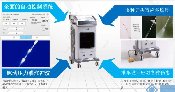 醫(yī)用創(chuàng)口沖洗機(jī)(多功能清創(chuàng)機(jī))適用于各種犬傷、擦傷、武器傷等外科新鮮創(chuàng)面,犬咬傷清創(chuàng)機(jī)由西安交大、中科院光機(jī)所、第四軍醫(yī)大學(xué)、西安藍(lán)茗醫(yī)療聯(lián)合研發(fā),是一款專(zhuān)業(yè)的傷口清洗設(shè)備。針對(duì)不同傷口,可選用不同流動(dòng)液體做為清洗液(肥皂水、生理鹽水等),徹底清除傷口雜物,污血,有效減少傷口細(xì)菌、病毒數(shù)量。