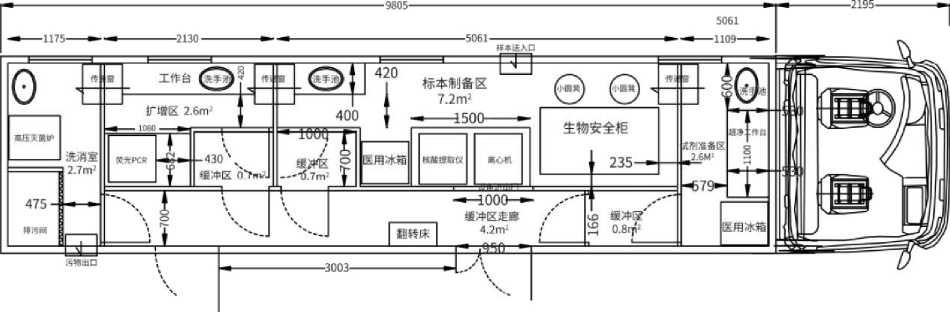 依據(jù)新冠核酸檢測(cè)實(shí)驗(yàn)室的要求和臨床基因擴(kuò)增檢驗(yàn)實(shí)驗(yàn)室區(qū)域設(shè)計(jì)原則,醫(yī)療大巴自動(dòng)化新冠核酸檢測(cè)醫(yī)療室設(shè)置以下區(qū)域:試劑準(zhǔn)備區(qū)、標(biāo)本制備區(qū)、擴(kuò)增區(qū)。醫(yī)療室整體達(dá)到加強(qiáng)型二級(jí)生物安全實(shí)驗(yàn)室標(biāo)準(zhǔn),確保醫(yī)療室工作人員的安全。同時(shí)預(yù)留“平戰(zhàn)結(jié)合”的擴(kuò)展能力,以便醫(yī)療室在非疫情期間同樣可以適用于其他類型的核酸檢測(cè)和基因測(cè)序工作。