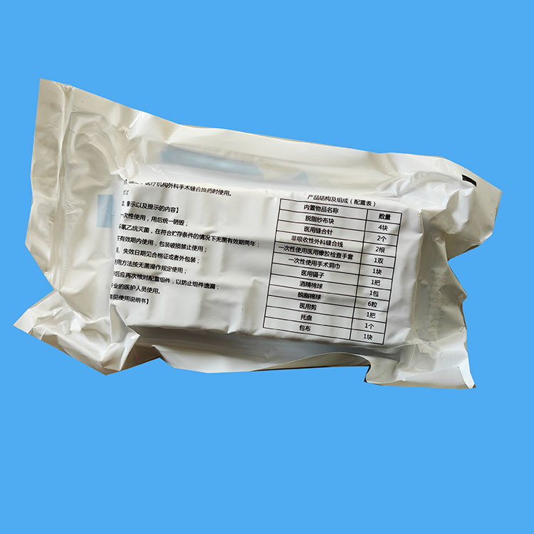 【結(jié)構(gòu)及組成】:縫合型由基本配置脫脂紗布塊、醫(yī)用縫合針、非吸收性外科縫合線和選配配置一次性使用手術(shù)洞巾、一次性使用治療巾、一次性使用醫(yī)用橡膠檢查手套、一次性使用聚乙烯檢查手套、一次性使用滅菌橡膠外科手套、醫(yī)用鑷子、醫(yī)用剪、手術(shù)刀片、酒精棉球、碘伏棉球、脫脂棉球、托盤、包布組成;換藥型由基本配置脫脂紗布塊和選配配置一次性使用手術(shù)洞巾、一次性使用治療巾、一次性使用醫(yī)用橡膠檢查手套、一次性使用聚乙烯檢查手套、一次性使用滅菌橡膠外科手套、醫(yī)用鑷子、手術(shù)刀片、酒精棉球、碘伏棉球、脫脂棉球、托盤、包布組成。