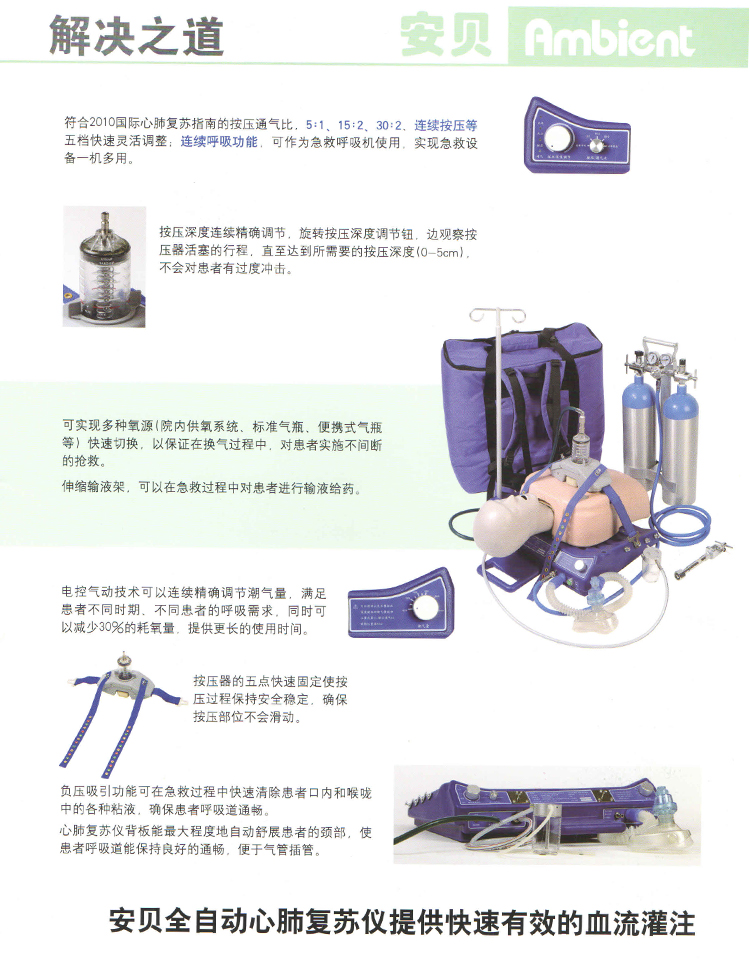 詳細(xì)介紹:1、集同步胸外按壓、間歇正壓通氣、吸痰、給氧、輸液功能于一體2、移動、攜帶方便快捷,適合院前急救、院內(nèi)搶救3、人機工程學(xué)設(shè)計,主機背板設(shè)計科學(xué)合理,開 放呼吸道簡單快捷,胸 部固定器可根據(jù)病人體型適當(dāng)調(diào)整和固定4、啟動迅速,10秒鐘內(nèi)能夠快速啟動心肺復(fù)蘇機,對搶救病人及時準(zhǔn)確5、配置齊全,功能強大,給氧給藥、胸外按壓、吸引集中設(shè)計,為心肺復(fù)蘇提供可靠措施