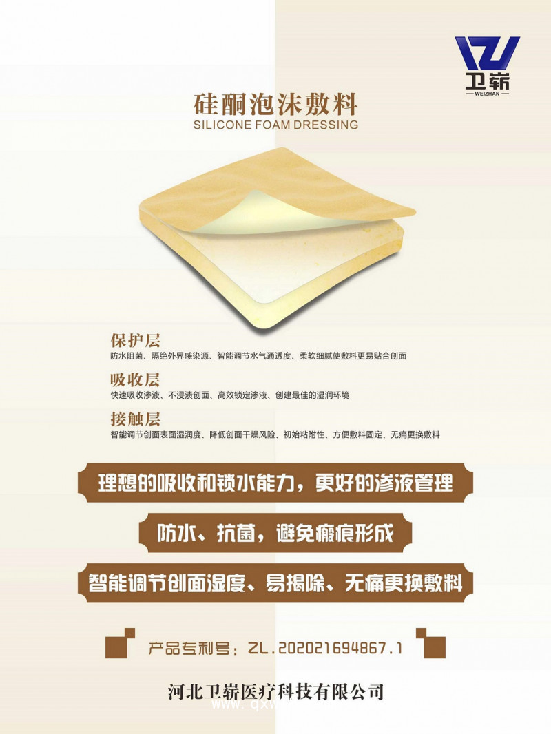 2、不粘貼合。先進硅膠打孔技術,對于干性皮膚,脆弱皮膚的貼合和剝離時都可以起到很好的保護作用。不粘附濕性傷口表面,減少更換時對傷口創(chuàng)面的創(chuàng)傷,減少疼痛。聚氨酯吸收層泡沫墊在吸收滲出液后,會迅速膨脹凸出,使敷料與傷口貼合更緊密,減少死腔和滲液殘留,降低浸漬和感染發(fā)生風險。