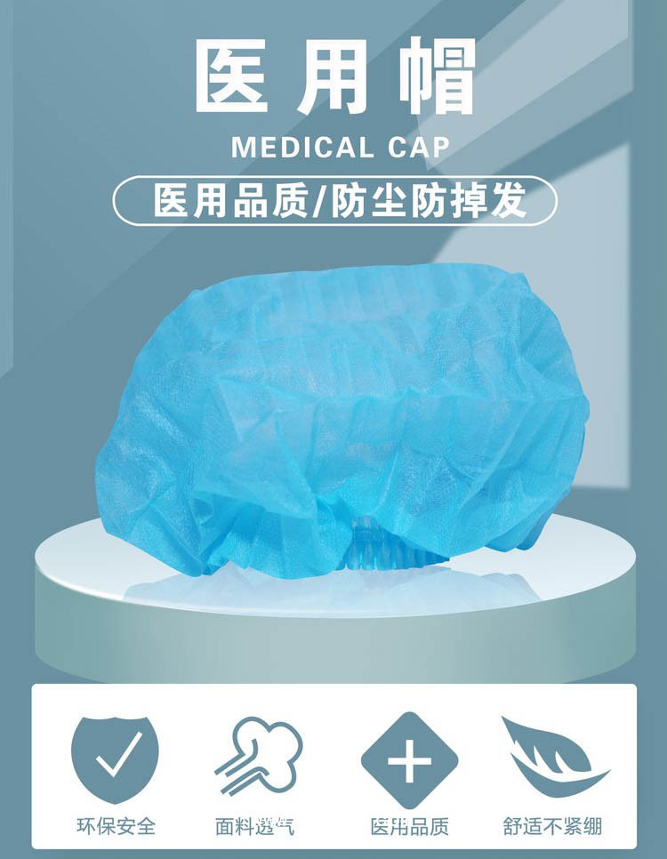 醫(yī)用帽一般采用非織造布為主要原料,經(jīng)裁剪、縫紉制成。非無菌提供,一次性使用。