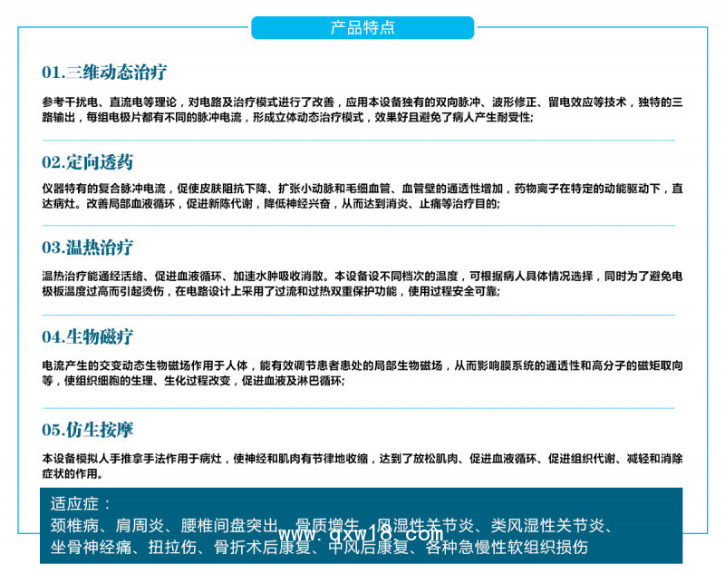 ? ? ? ? 獨具特色的三維動態(tài)治療模式,大范圍的動態(tài)干擾場,針對局部疼痛部位治療同時也對代償性病變部位進行全方位治療。