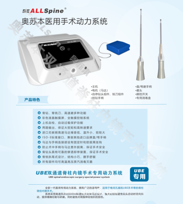 3 、UBE專用動力系統(tǒng),我們的醫(yī)用動力系統(tǒng)標(biāo)配用于(開放手術(shù),UBE手術(shù),還可以選配用于椎間孔鏡手術(shù))