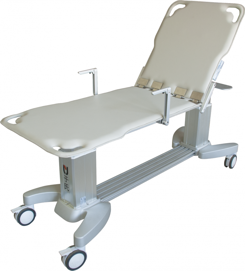 【使用方法】本產(chǎn)品使用時,打開兩側(cè)護(hù)欄,手控器調(diào)節(jié)車架床面高度。調(diào)節(jié)到合適高度時,關(guān)閉腳輪剎車,將患者移動到轉(zhuǎn)移車床面,關(guān)好護(hù)欄。推車到檢查床邊時,打開護(hù)欄,調(diào)節(jié)兩床在同一水平位置,將患者水平推過檢查床,患者略側(cè)身收回過床易,待檢查完畢后,重復(fù)上述操作,將患者移入車上,關(guān)上護(hù)欄,退出檢查室。