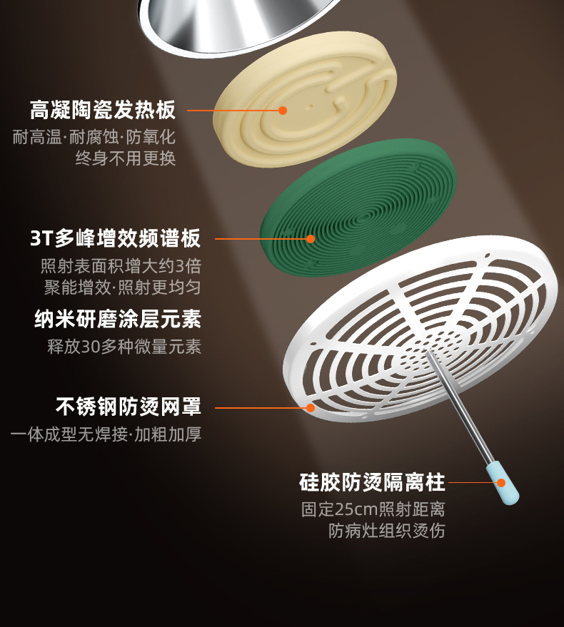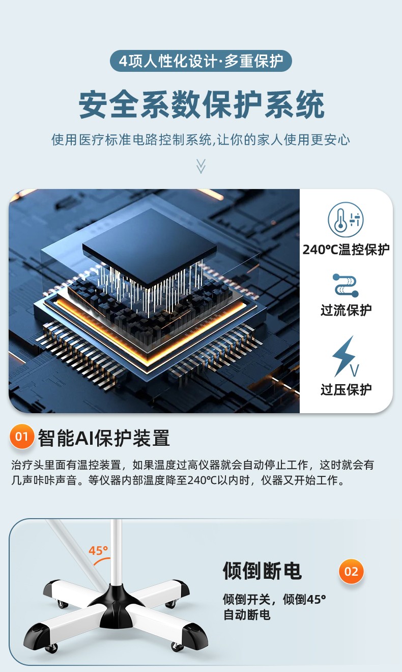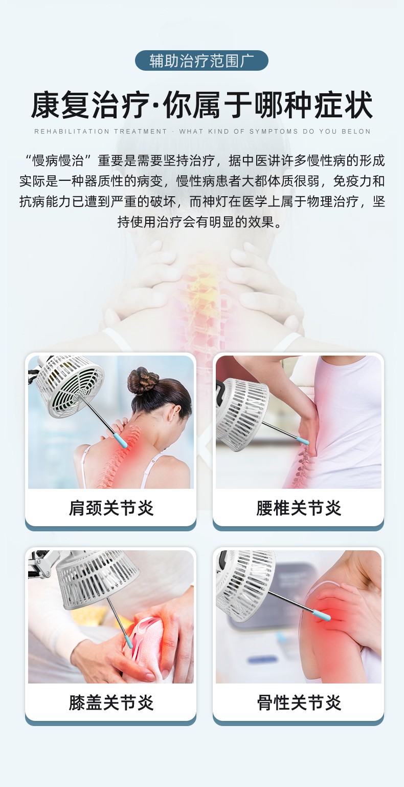 凌遠(yuǎn)立式電磁波譜治療儀(神燈[TDP]治療儀)LY-607A是傳統(tǒng)神燈、紅外線治療儀的升級(jí)型產(chǎn)品。采用3T多峰增效頻譜專利技術(shù),具有發(fā)熱均勻、照射舒適、照射面積增大、寬頻等特點(diǎn)。并解決了傳統(tǒng)神燈用電熱絲作為發(fā)熱源而導(dǎo)致治療板發(fā)熱不均、容易燒壞燒斷、更換頻率高等技術(shù)缺陷。電磁波譜治療儀在溫度的作用下,產(chǎn)生對(duì)人體有益的微量電磁波,通過生物熱效應(yīng)作用于人體。針對(duì)某-患部或穴位的特定照射,達(dá)到輔助治療的目的。并擁有國(guó)家專利、歐盟CE認(rèn)證、美國(guó)FDA的醫(yī)用治療儀。特點(diǎn)頭部和支架可分離,具有防燙隔離柱防止用戶燙傷,治療板3T效果更好,終身不需要更換耗材