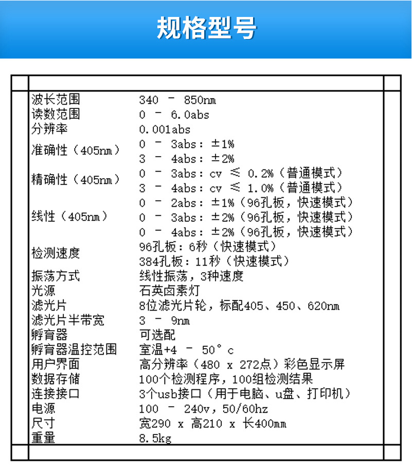 精確性(405nm):CV≤0.2%(0-3Abs),CV≤1.0%(3-4Abs),標(biāo)準(zhǔn)測量模式