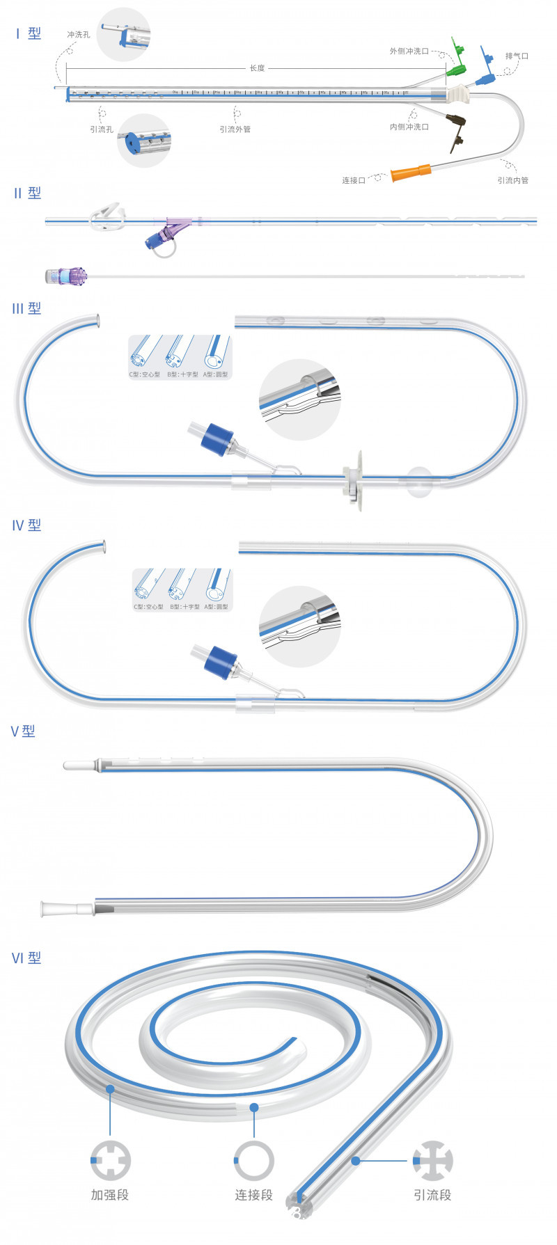 一次性使用多功能引流導(dǎo)管根據(jù)主要結(jié)構(gòu)不同可分為YN-F-Ⅰ、YN-F-Ⅱ、YN-F-Ⅲ、YN-F-Ⅳ、YN-F-Ⅴ、YN-X-Ⅵ六個型號。YN-F-Ⅰ型由引流管、套管、沖洗管、排氣管和接頭組成;YN-F-Ⅱ型由引流段、連接段、閥門、羅伯特夾、沖洗管組成;YN-Ⅲ型由引流段、連接段、球囊、固定夾、充起閥組成,YN-F-Ⅳ型由引流段、連接段、沖洗閥組成,YN-F-Ⅴ型由引流管和接頭組成,YN-X-Ⅵ型由引流管和引導(dǎo)針(選配)組成。本產(chǎn)品的引流管組件由硅橡膠制成,其他組件由PVC、ABS、PC、PE、POM、PP、304不銹鋼制成。