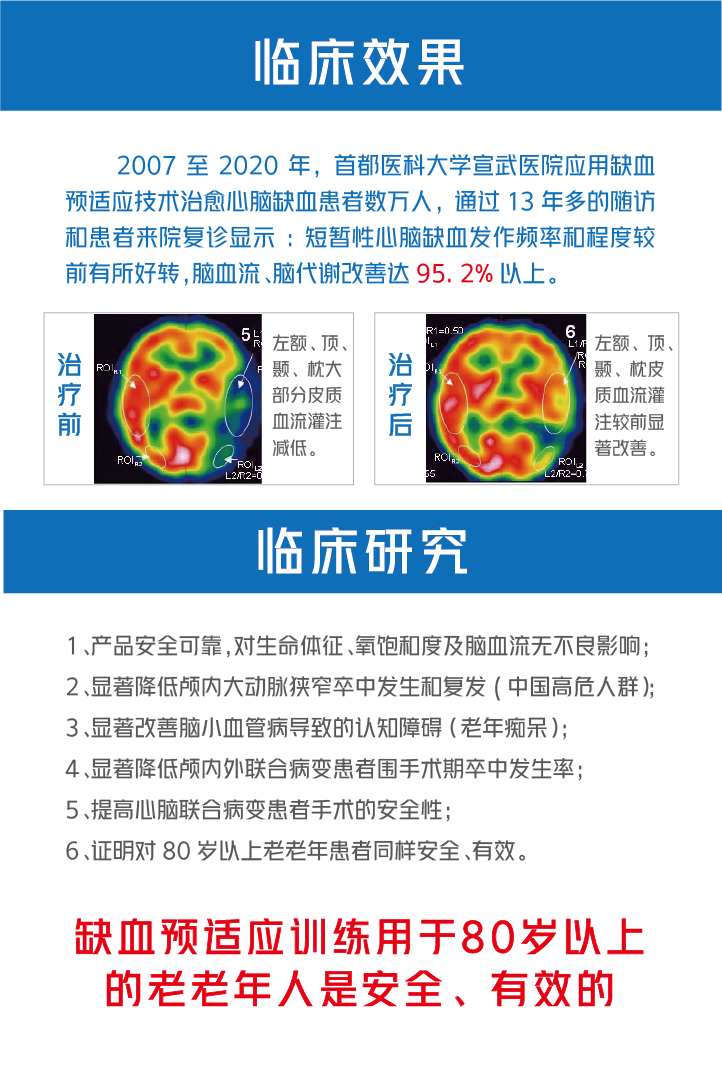 2007至2015年,北京首都醫(yī)科大學(xué)宣武醫(yī)院應(yīng)用缺血預(yù)適應(yīng)技術(shù)治愈心腦缺血患者上萬人,通過8年多的隨訪和患者來院復(fù)診顯示:短暫性心腦缺血發(fā)作頻率和程度較前有所好轉(zhuǎn),腦血流、腦代謝改善達(dá)95. 2%以上。