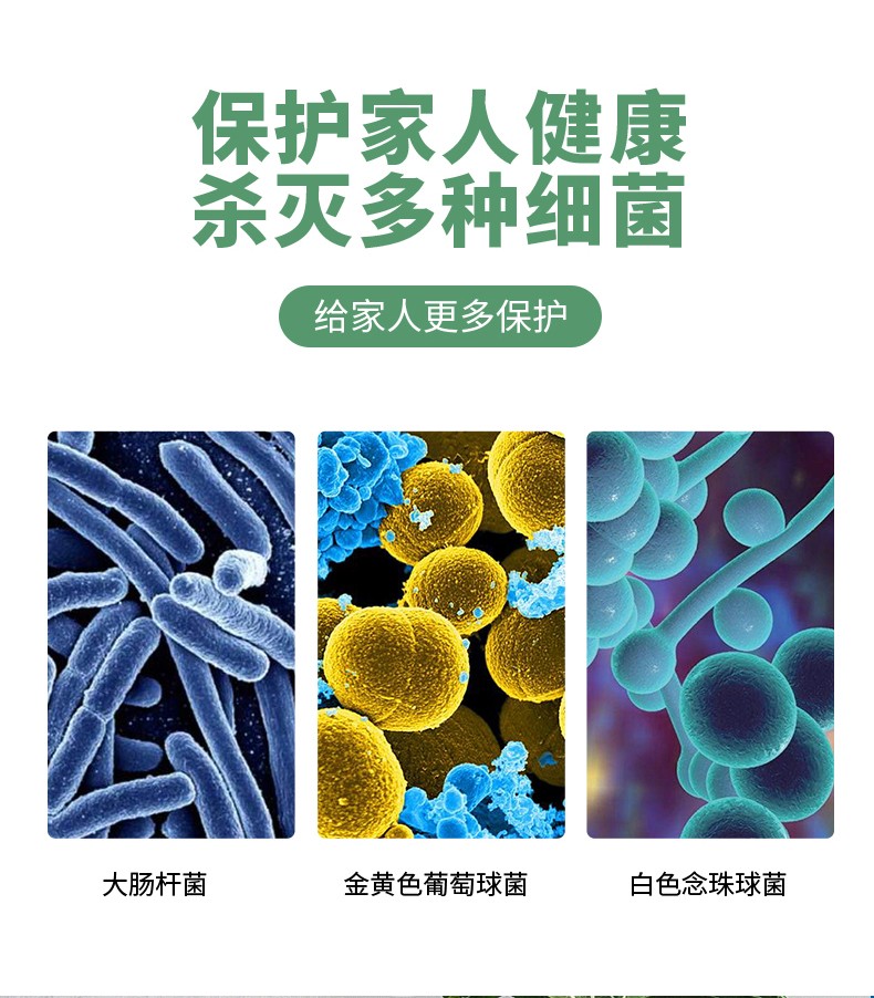 殺滅微生物類別:對大腸桿菌、金黃色葡萄物類別球菌、白色念珠菌有消殺
