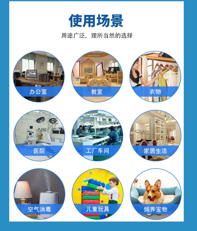 [適用范圍]適用于一般物體表面消毒,手部消毒,機(jī)翼地面、空間和環(huán)境消毒。適用于醫(yī)療領(lǐng)域和公共場(chǎng)所,日常生活中的環(huán)境、物表殺菌消毒。建議根據(jù)使用場(chǎng)景選擇產(chǎn)品適用類型。