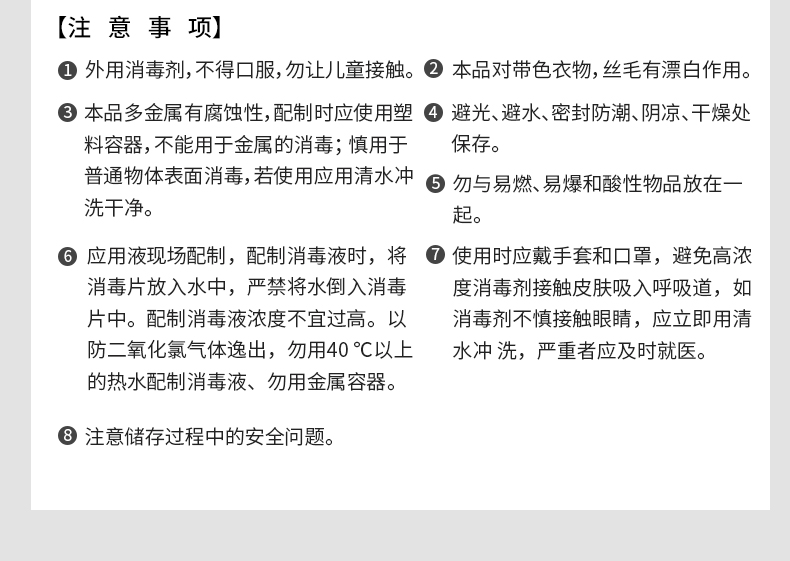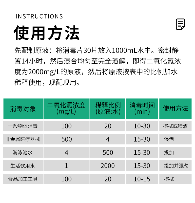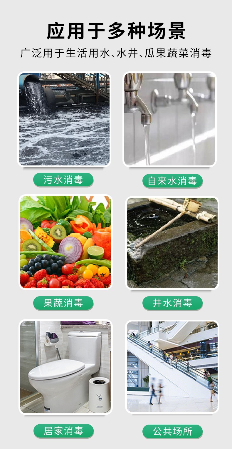 使用范圍:適用于家庭、飯店、醫(yī)院公共場所的一般物體表面、非金屬醫(yī)療器械消毒、游泳池水消毒、生活飲用水消毒、食品加工工具消毒。