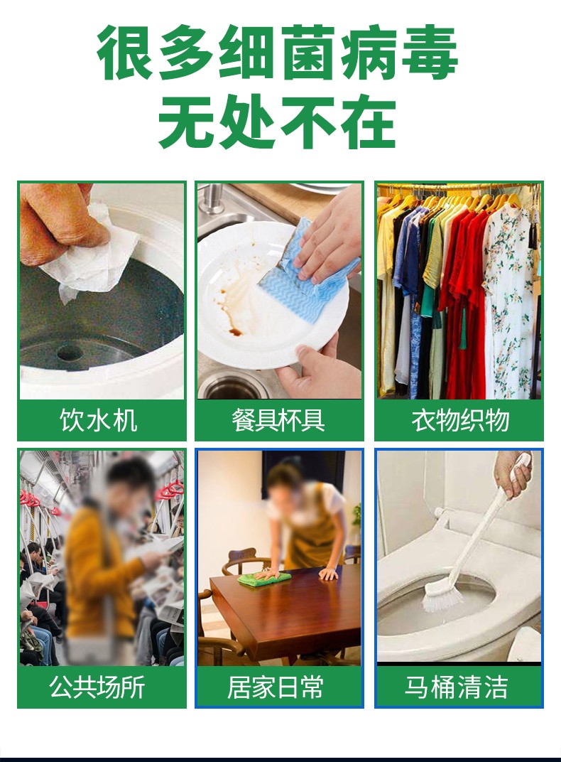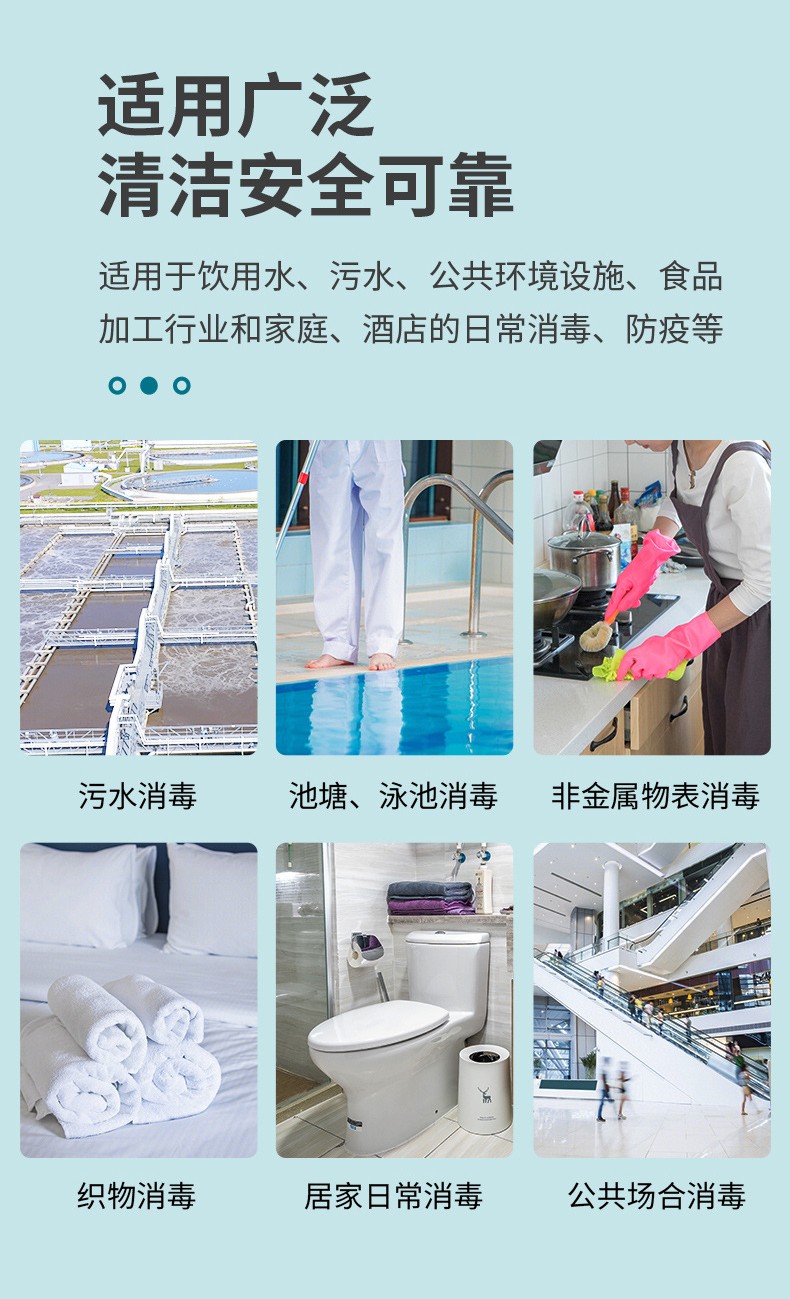 使用范圍:適用于家庭、飯店、醫(yī)院公共場所的一般物體表面、非金屬醫(yī)療器械消毒、游泳池水消毒、生活飲用水消毒、食品加工工具消毒。
