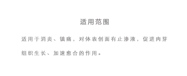 適用于消炎、鎮(zhèn)痛,對(duì)體表創(chuàng)面有止?jié)B液,促進(jìn)肉芽組織生長、加速愈合的作用。
