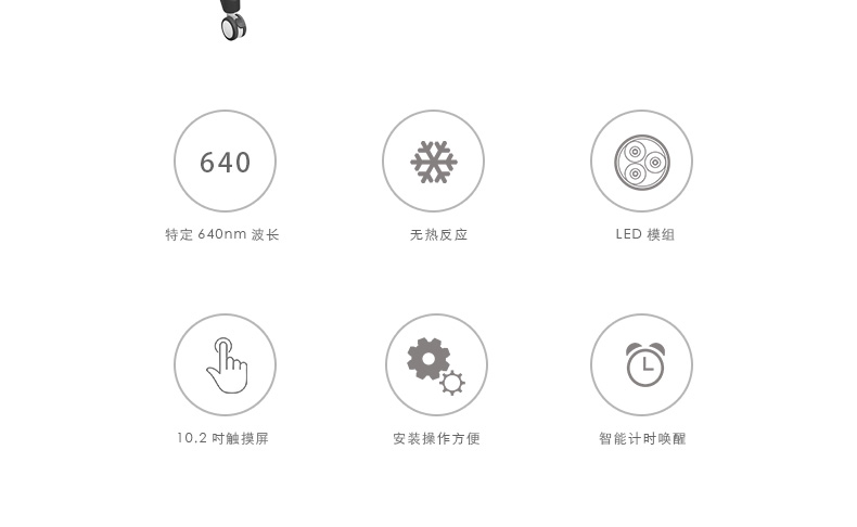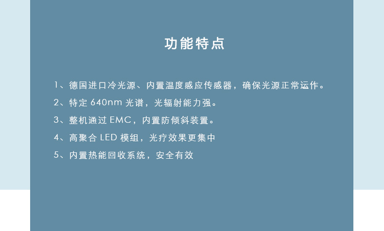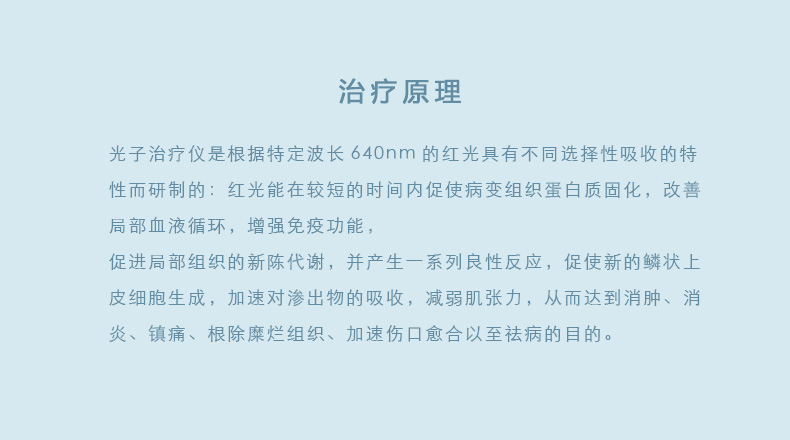 光子治療儀是根據(jù)特定波長640nm的紅光具有不同選擇性吸收的特性而研制的:紅光能在較短的時(shí)間內(nèi)促使病變組織蛋白質(zhì)固化,改善局部血液循環(huán),增強(qiáng)免疫功能,