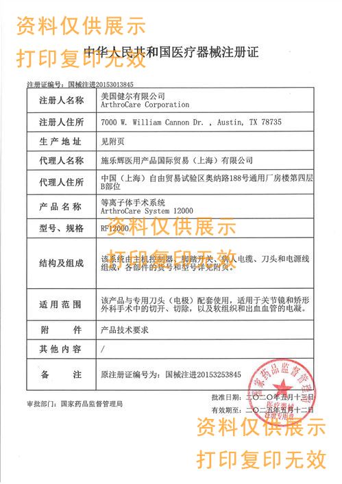 注冊證名稱:等離子體手術系統(tǒng)