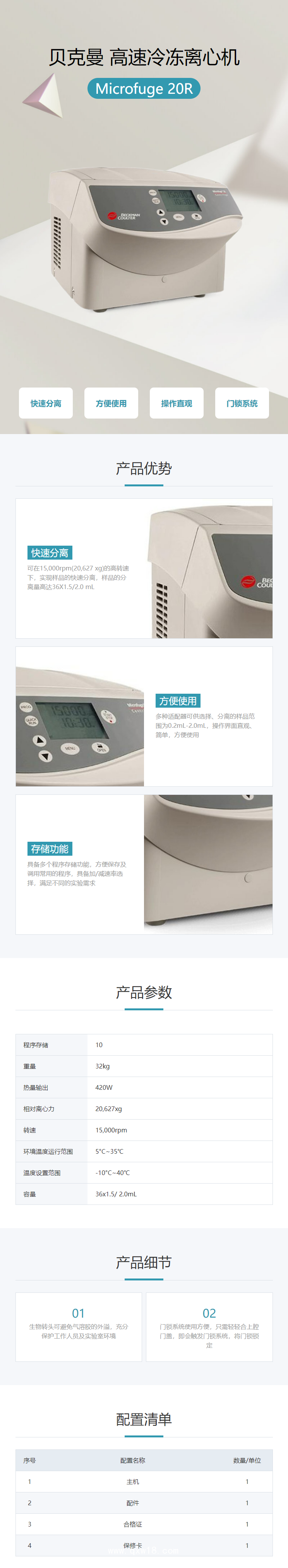 品牌 貝克曼BECKMAN ? 貨號 V521085 ? 注冊證編號 國械備20140177號 ? 型號 Microfuge 20R ? 轉(zhuǎn)速 15000r/min ? 最大相對離心力 20627Xg ? 容量 1.5/2ml*36支 ? 程序存儲 10 ? 尺寸 31*66*29.1cm ? 溫度設(shè)置范圍 -10℃—40℃ ? 凈重 32kg包裝