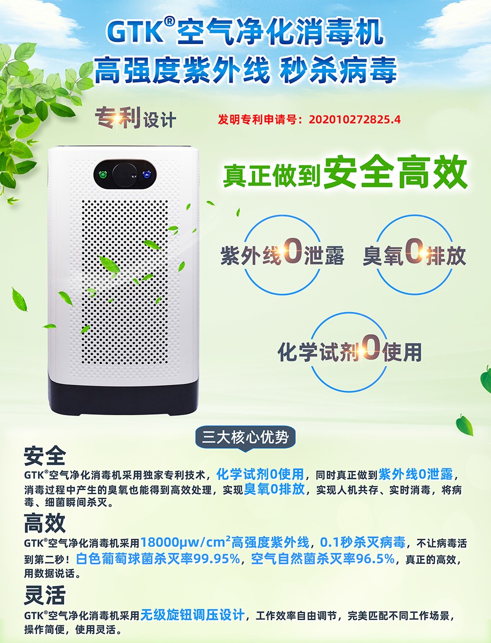 安全:GTK?空氣凈化消毒機(jī)采用專利技術(shù),化學(xué)試劑0使用,同時(shí)真正做到紫外線0泄露,消毒過程中產(chǎn)生的臭氧也能得到高效處理,實(shí)現(xiàn)臭氧0排放,實(shí)現(xiàn)人機(jī)共存、實(shí)時(shí)消毒,將病毒、細(xì)菌瞬間殺滅。
