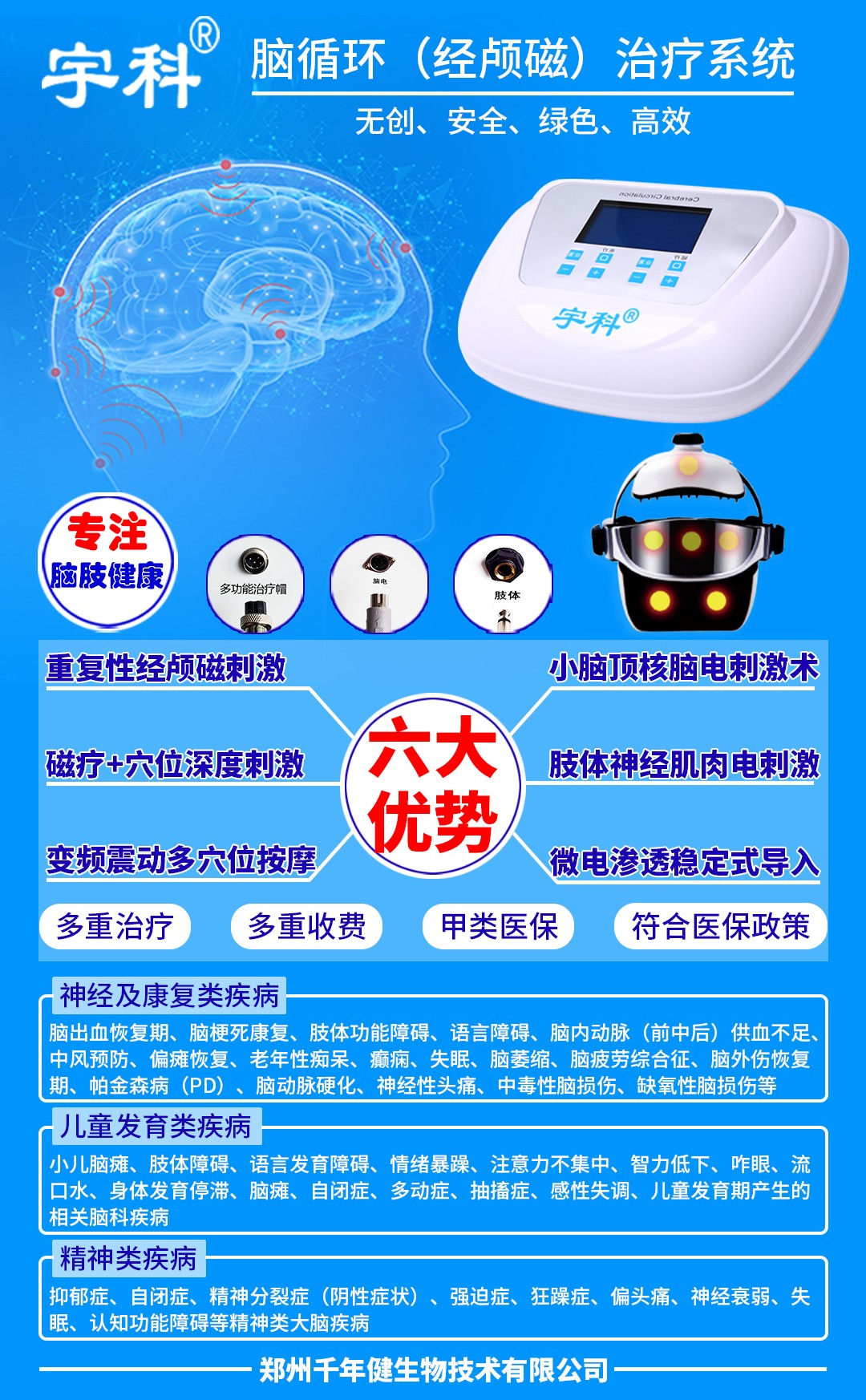 鄭州千年健生物技術(shù)有限公司是一家專注于智能醫(yī)療器械研發(fā)、生產(chǎn)、銷售、貼牌、售后、服務(wù)于一體的高新現(xiàn)代化集團企業(yè)。生產(chǎn):理療電極片(定向透藥電極),理療用體表電極,?醫(yī)用超聲耦合貼片,穴位壓力刺激貼、盆底肌肉康復(fù)器,沖洗器,醫(yī)用壓敏膠帶(醫(yī)用復(fù)合膠布,三伏貼),軀干固定器,醫(yī)用冰墊,上肢固定器,醫(yī)用隔離面罩,肢體壓力套,下肢固定器;超聲腦血管治療儀、腦循環(huán)功能障礙治療儀、超聲脈沖電導(dǎo)治療儀、中醫(yī)定向透藥治療儀、胃腸動力治療、經(jīng)顱磁治療儀,超聲電導(dǎo)透藥儀,多功能電針治療儀,電腦中頻治療儀、隔物灸治療儀、中風偏癱治療系統(tǒng)、中醫(yī)定向透化系統(tǒng)、中頻溫熱治療儀、中藥離子導(dǎo)入治療儀、智能眼部按摩儀,明目視力眼貼、熱敷蒸汽眼罩等;公司自成立之日起始終秉承“品質(zhì)第一、信譽第一、客戶至上”的原則;本著“依托科技創(chuàng)新,滿足客戶醫(yī)療需求,以人才為基礎(chǔ),謀求發(fā)展;以質(zhì)量為生命,體現(xiàn)價值;以信譽為根本,立足百年”的理念;