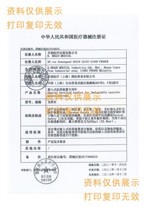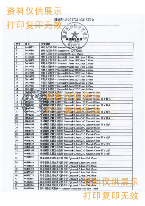 ? ? ?本產(chǎn)品由穿刺針、固定翼、延長(zhǎng)管、扣夾、無(wú)針接頭及針尖保護(hù)裝置組成。Surecan Safety II 壓力注射無(wú)損穿刺針用于插入皮下注射座的隔膜。在拔針過(guò)程中自動(dòng)激活Surecan Safety II安全功能,有助于防止意外被針刺傷。當(dāng)用于高壓注射造影劑時(shí),最大推薦壓力為325psi(22.4bar)。