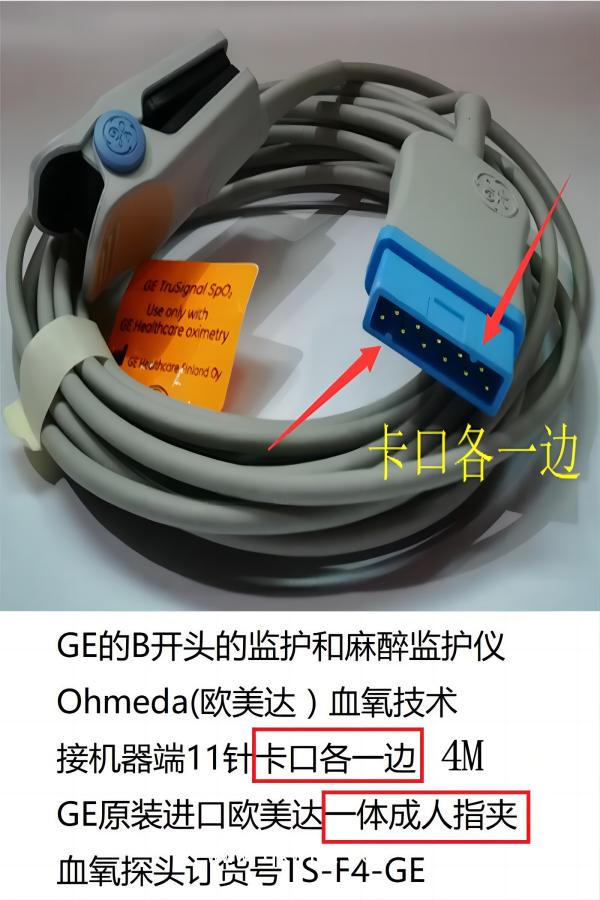 ?GE的B開頭的監(jiān)護和麻醉監(jiān)護儀,Ohmeda(歐美達)血氧技術(shù),接機器端11針卡口各一邊GE原裝進口歐美達Ohmeda血氧技術(shù)一體成人指夾血氧探頭4m訂貨號TS-F4-GE?