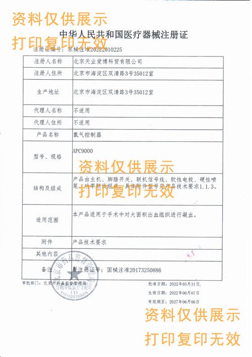 氬氣控制器對應(yīng)注冊證號:京械注準20222010225