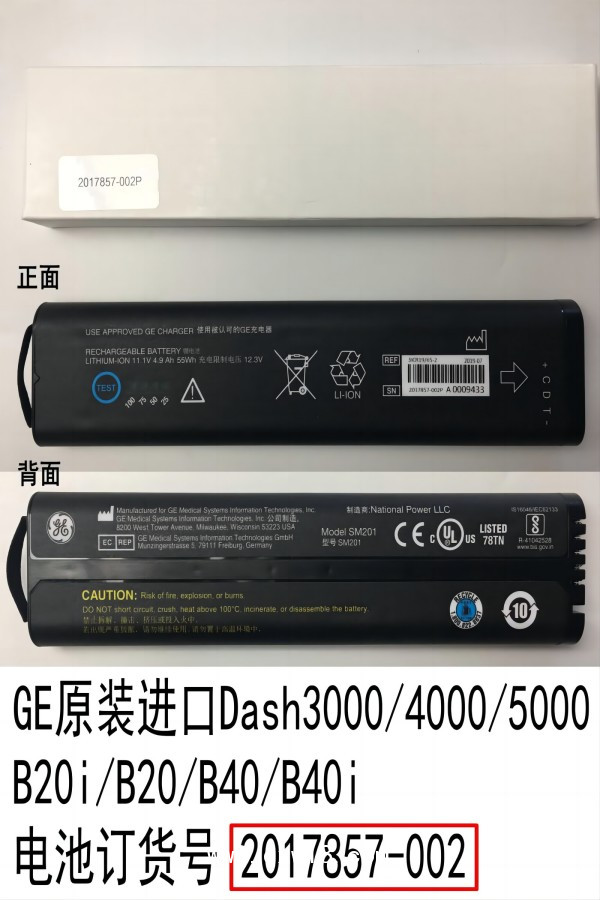 GE原裝進(jìn)口Dash3000/4000/5000? B20i/B20/B30/B40/B40i 鋰電池 11.1V? 4.9Ah 55Wh(重量≈0.35公斤)型號(hào) SM201 訂貨號(hào)2017857-002P