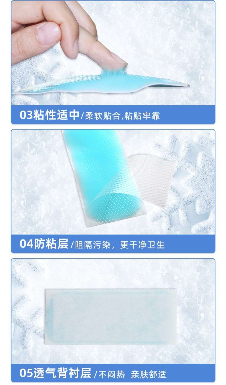 高分子透明凝膠:通過敏感肌測試,溫和不刺激;親膚凝膠,粘性好不脫膠:親膚凝膠層,散熱更快、更持久;舒適柔軟:大面積彈力布,可根據(jù)使用面積裁剪后再使用;獨(dú)立包裝,鎖住有效成分:每袋紙鋁帶包裝,水分不流失,便于保存;氣味溫和不刺激,適合嬰幼兒的尺寸:抗敏材料不會對眼睛產(chǎn)生刺激,呵護(hù)寶寶肌膚,進(jìn)口高分子凝膠基劑,剝離不留膠;