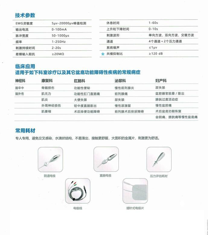 主要用于盆底障礙疾病、產(chǎn)后康復(fù)以及腦卒中、顱腦損傷、脊髓損傷、小兒腦癱、外周神經(jīng)損傷、痙攣狀態(tài)、遲緩性癱瘓、廢用性肌萎縮、疼痛綜合征、關(guān)節(jié)活動受限、假肢功能訓練、神經(jīng)功能性障礙(如緊張癥等)臨床問題