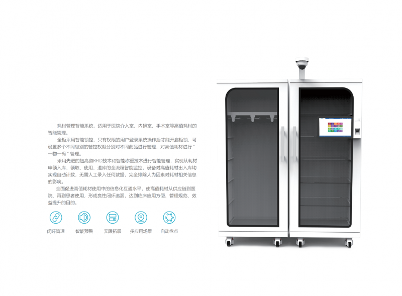 ???????? 全柜采用智能鎖控,只有權(quán)限的用戶登錄系統(tǒng)操作后才能開啟柜鎖,可設(shè)置多個不同級別的管控權(quán)限分別對不同藥品進(jìn)行管理,對高值耗材進(jìn)行 “一物一碼 ” 管理。采用先進(jìn)的超高頻RFID技術(shù)和智能稱重技術(shù)進(jìn)行智能管理實現(xiàn)從耗材申領(lǐng)入庫、領(lǐng)取、使用、退庫的全流程智能監(jiān)控,設(shè)備對高值耗材出入庫均實現(xiàn)自動計數(shù),無需人工錄入任何數(shù)據(jù),完全排除人為因素對耗材相關(guān)信息的影響。全面促進(jìn)高值耗材使用中的信息化互通水平,使高值耗材從供應(yīng)鏈到醫(yī)院、再到患者使用,形成良性閉環(huán)追溯,達(dá)到臨床應(yīng)用方便管理規(guī)范、效益提升的目的。