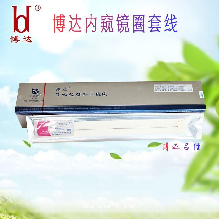 邦達(dá)牌,可吸收性外科縫線,(內(nèi)窺鏡圈套線)線體采用天然材質(zhì)經(jīng)濕紡工藝加工而成,具有抗拉力強(qiáng)、生物相容性好、毒副作用小和打結(jié)牢固等優(yōu)點(diǎn)。產(chǎn)品廣泛適用于內(nèi)窺鏡手術(shù)中對闌尾、膽囊、子宮肌瘤、輸卵管和其他外科腫瘤組織的結(jié)扎,臨床使用10余年反應(yīng)良好,深受好評。