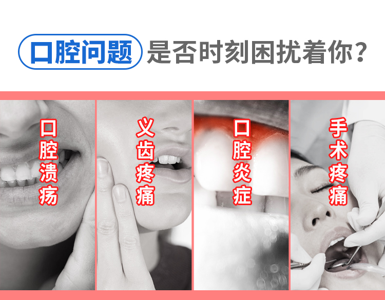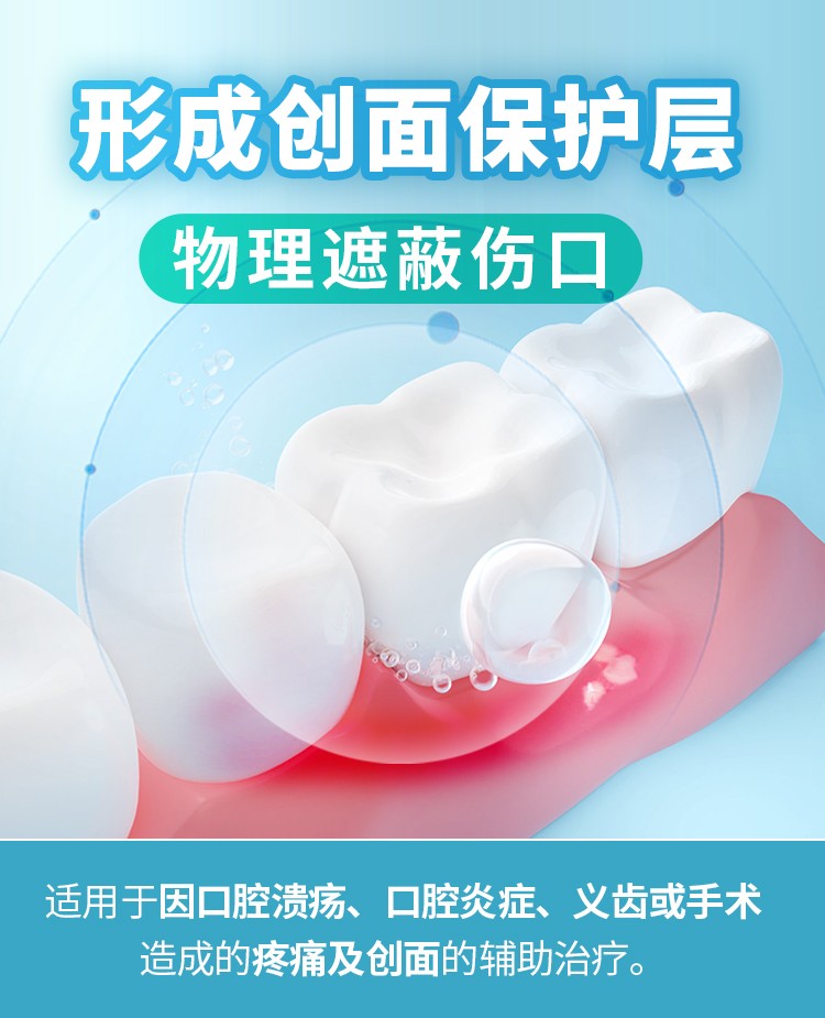 【適用范圍】本產品通過在潰瘍表面或組織創(chuàng)面形成保護層,物理遮蔽傷口,適用于因口腔潰瘍、口腔炎癥、義齒或手術造成的疼痛及創(chuàng)面的輔助治療。