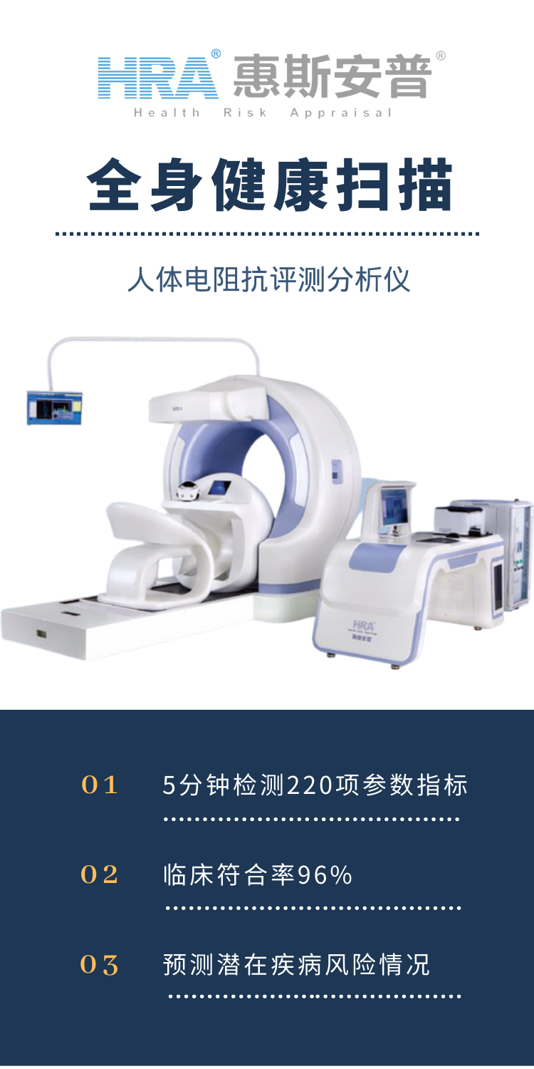 惠斯安普的HRA全生命周期健康管理醫(yī)療設(shè)備,5分鐘左右掃描全身,即可實現(xiàn)對人體整體各組織、各器官功能全面監(jiān)測,并對亞健康及早期病變進(jìn)行準(zhǔn)確地評估,預(yù)測潛在的危險因素及疾病發(fā)展方向,對疾病風(fēng)險作出早期預(yù)警(0疼痛)