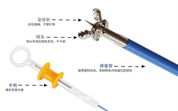 一次性使用活檢鉗由鉗頭,彈簧管,手柄組成