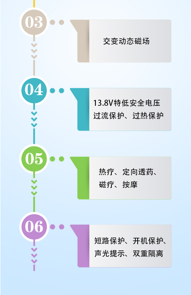 1、五大特點(diǎn):中頻仿生按摩、非對(duì)稱離子導(dǎo)入、溫?zé)嶂委煛⑸锎暖熂熬C合治療