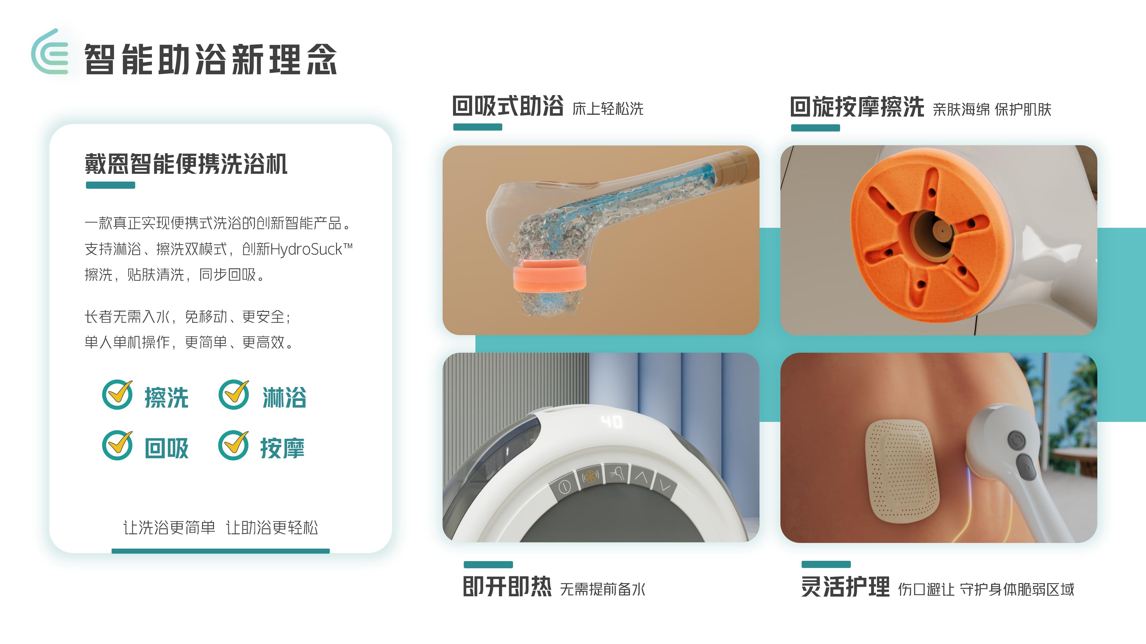 “智能便攜洗浴機(jī)”解決洗浴助浴難題,創(chuàng)新回吸式洗浴,免入水、免移動(dòng)、床上擦洗更安心,即熱恒溫、便攜靈活,適用更多場(chǎng)景。智能助浴不僅幫助用戶便攜助浴,還推動(dòng)護(hù)理行業(yè)增質(zhì)提效、革新護(hù)理模式,真正讓洗浴更簡(jiǎn)單,讓助浴更輕松。