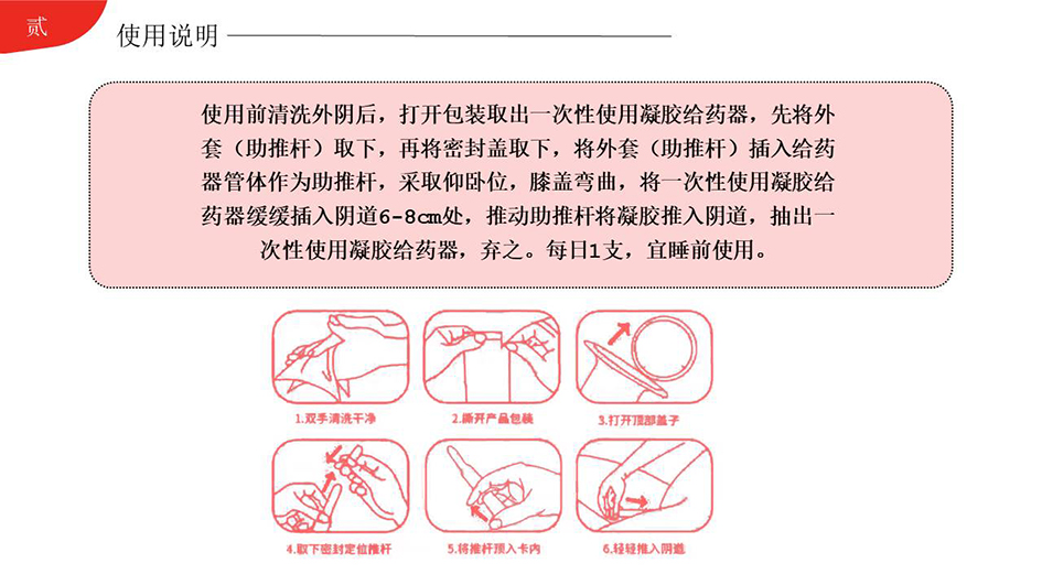 【使用方法】使用前清洗外陰后,打開包裝取出一次性使用凝膠給藥器,先將外套(助推桿)取下,再將密封蓋取下,將外套(助推桿)插入給藥器管體作為助推桿,采取仰臥位,膝蓋彎曲,將一次性使用凝膠給藥器緩緩插入陰道6-8cm處,推動(dòng)助推桿將凝膠推入陰道,抽出一次性使用凝膠給藥器,棄之。每日1支,宜睡前使用。