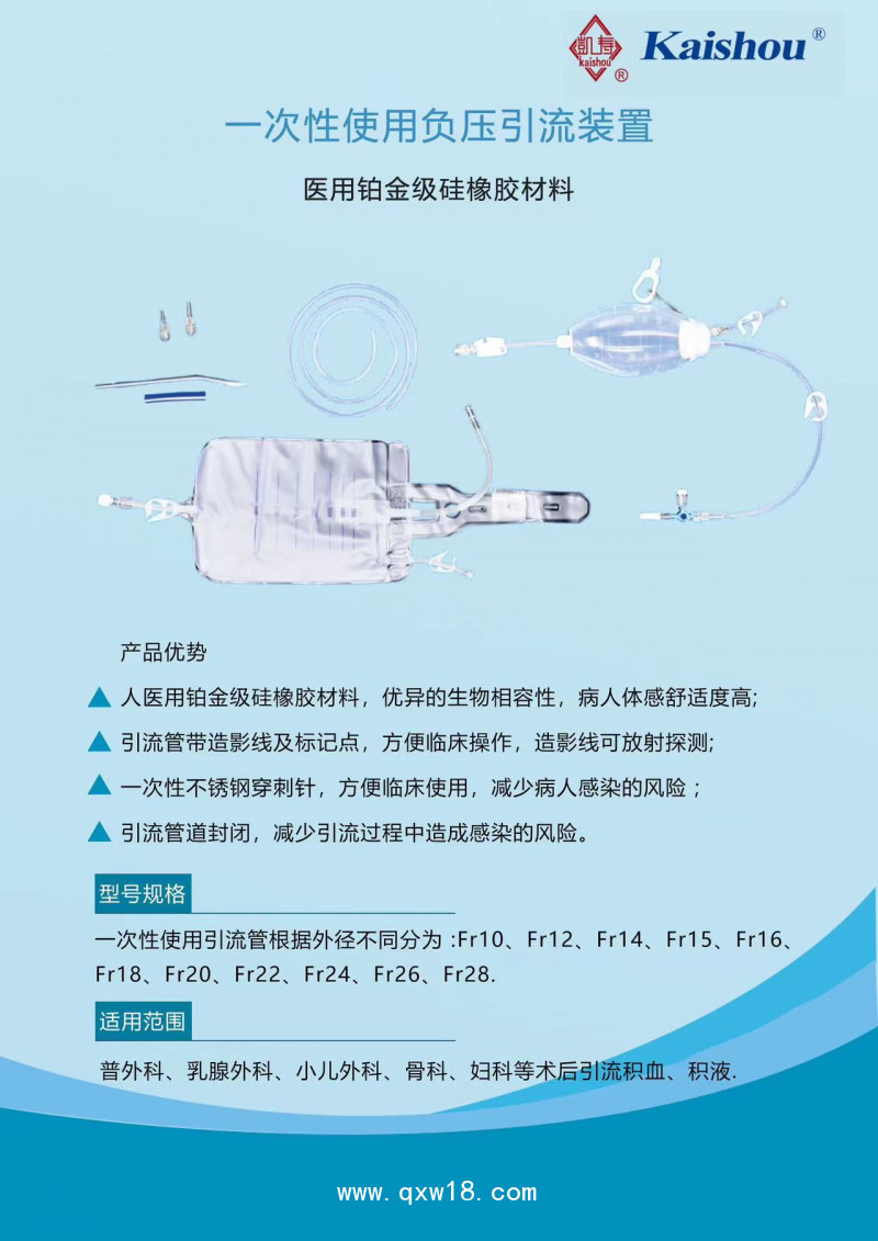 適用科室:神外、普外、肝膽、胸外和骨科等的臨床術后引流。