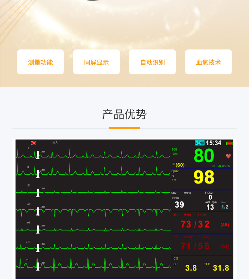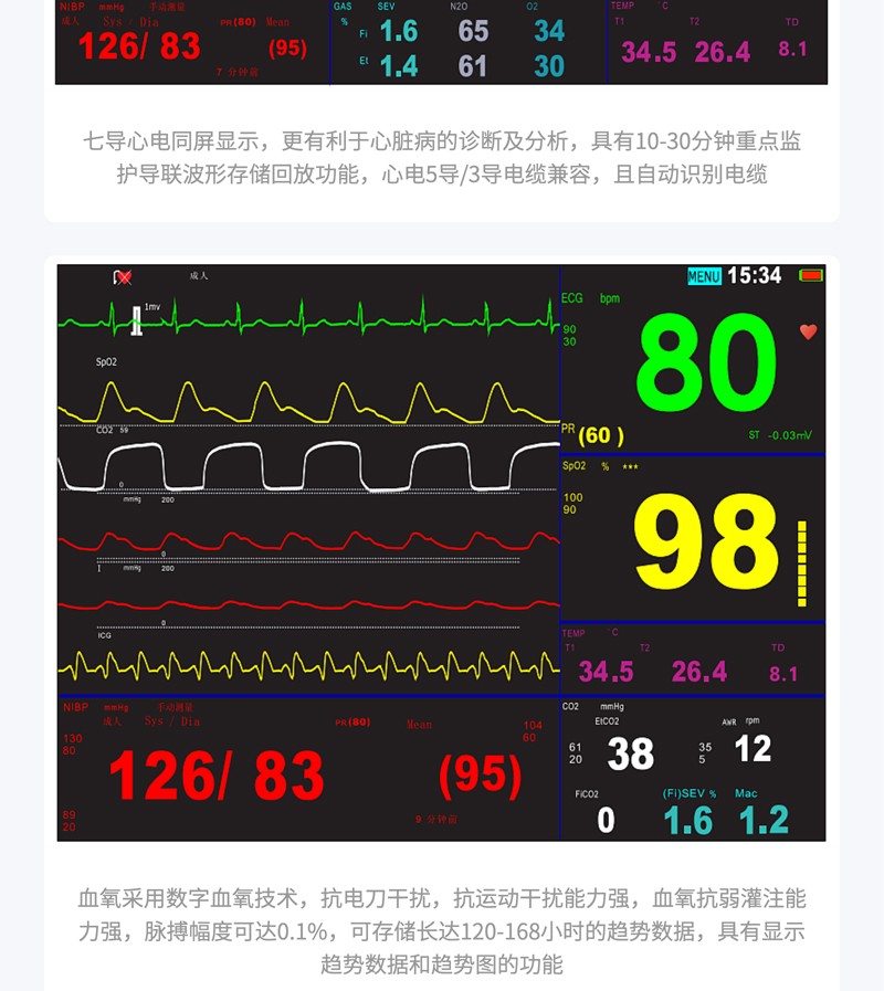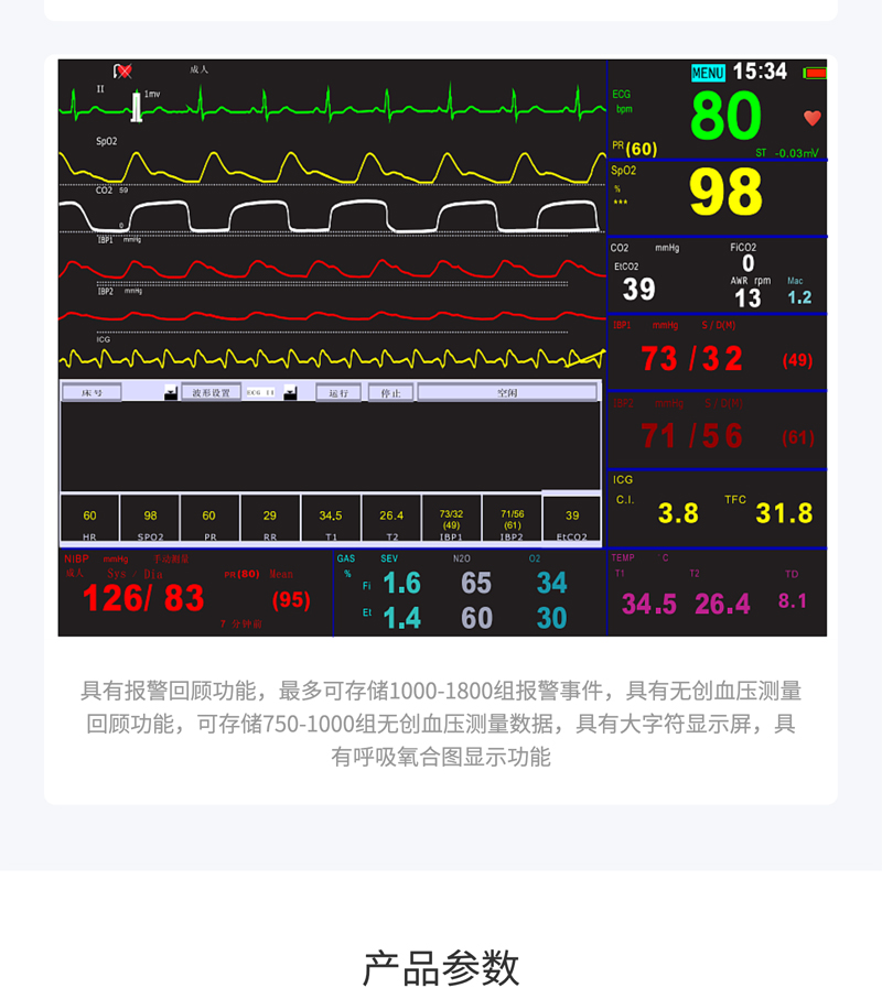 監(jiān)測功能:?標(biāo)配心電、呼吸、血氧飽和度、無創(chuàng)血壓、脈搏、雙通道體溫監(jiān)測