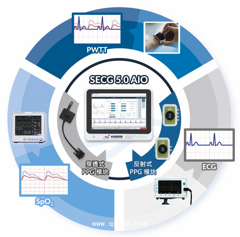 搭配穿透式血氧性能測試模塊 PPG-2TF-660模擬 ECG 和 PPG 信號,進行 SpO2?和 PWTT(Pulse Wave Transit Time,脈搏波傳導時間)測試