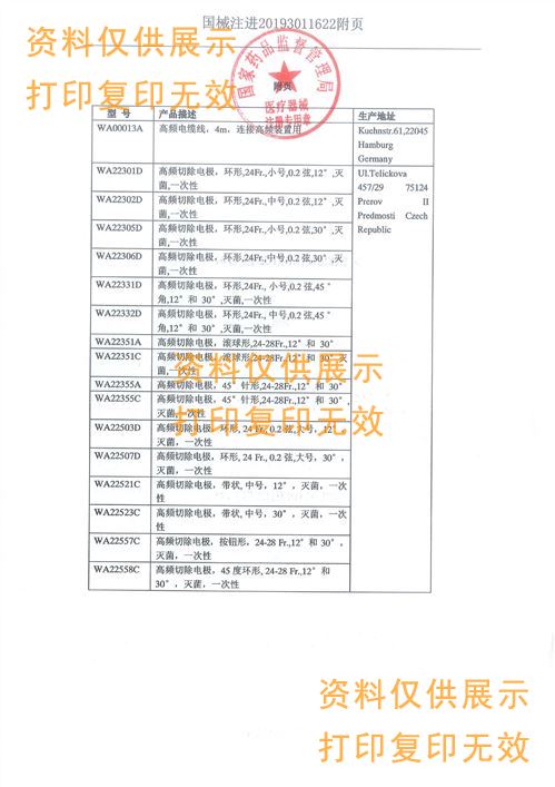 適用范圍/預期用途:該產(chǎn)品與內(nèi)窺鏡和高頻電刀配套使用,經(jīng)尿道或?qū)m頸在生理鹽水下對前列腺或?qū)m腔進行凝固、切割和等離子汽化操作。(WA22558C僅用于前列腺治療)