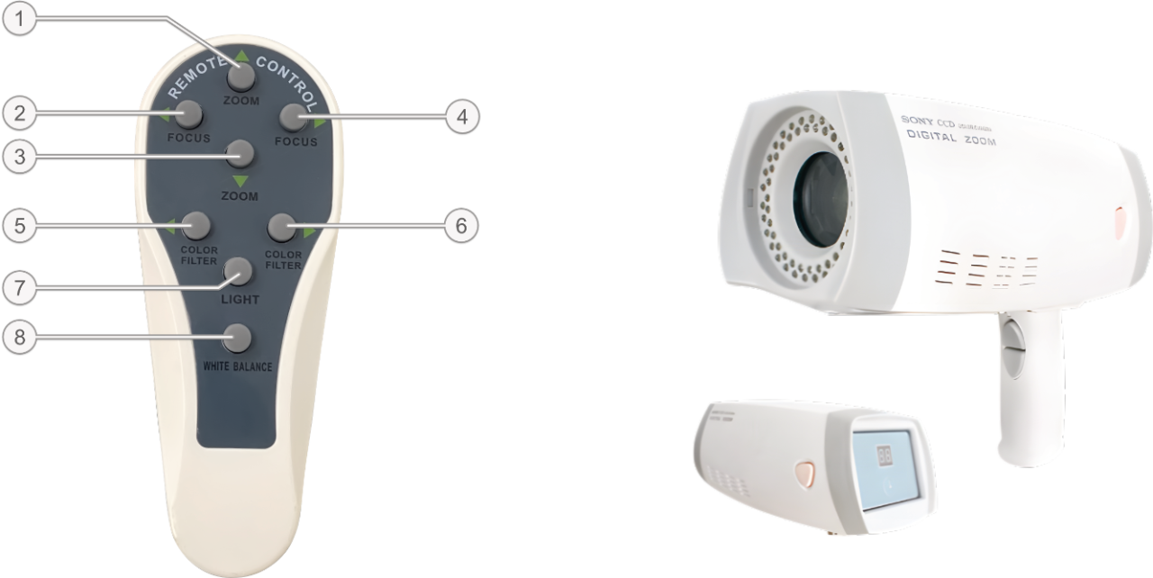 配有按鍵遙控手柄,操控圖像放大、縮小、凍結(jié)、電子綠色濾鏡、圖像顯示